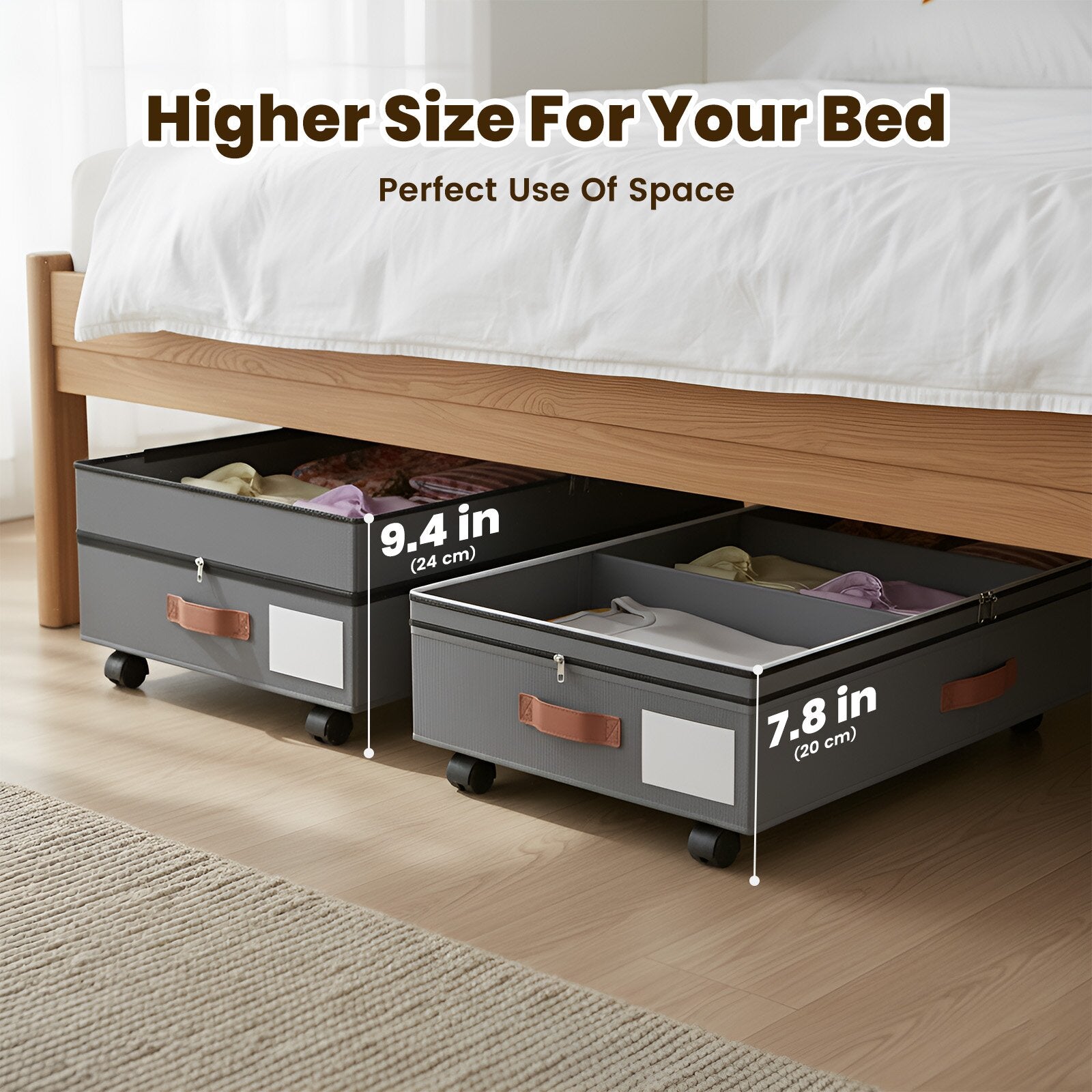 Under Bed Storage with Wheels, 2 Packs Large Underbed Organizer with Lid, 10'' Adjustable Height Shoes Containers Clothes Rolling Bin for Bedroom Dorm, Gray