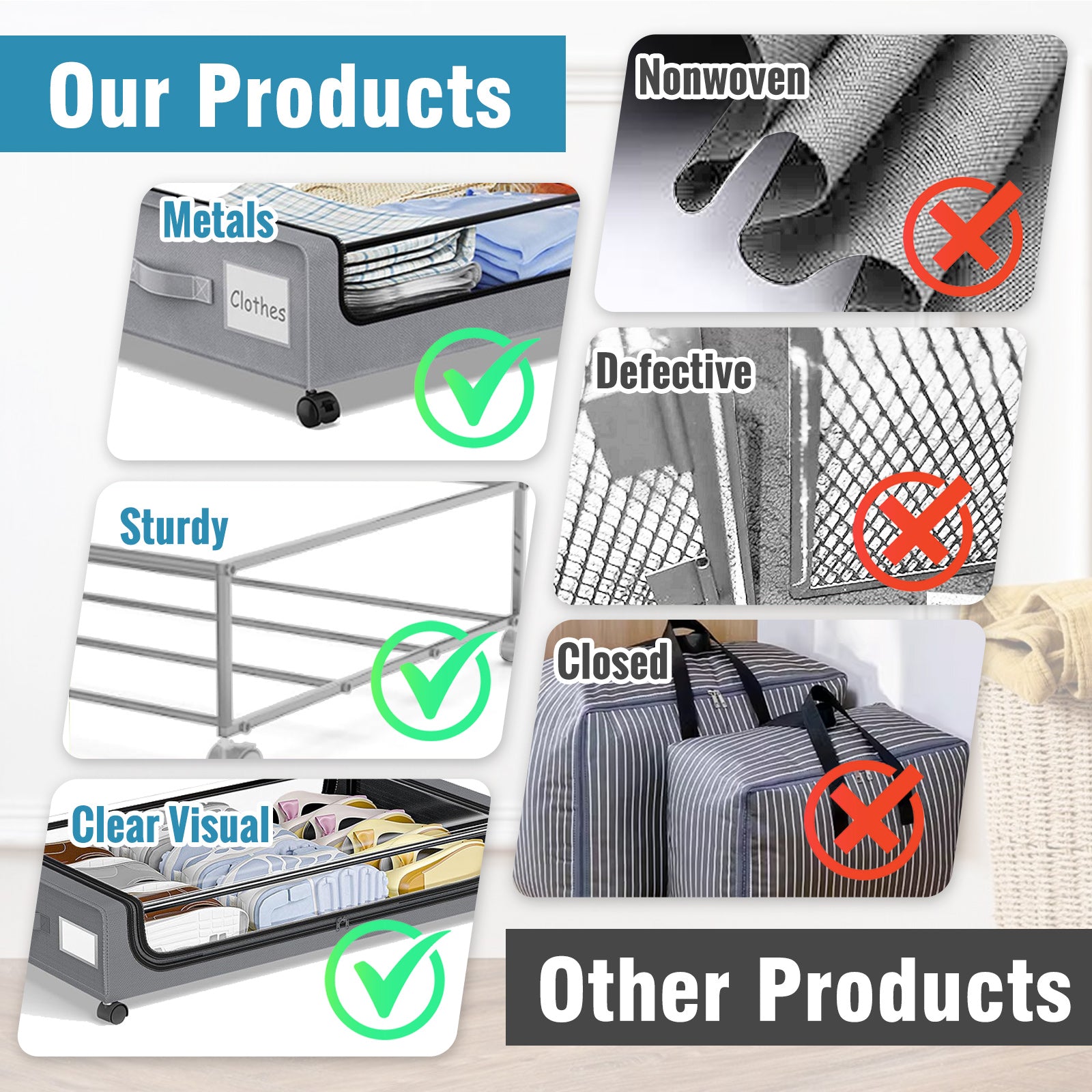 This under-bed storage box is designed to maximize unused space beneath your bed like magic. With a height of only 7.2 inches, it fits most beds perfectly, making the most of every inch of space. The transparent window allows you to quickly see what's inside for easy access. The smooth zipper keeps dust out, ensuring your items stay fresh. Built with a sturdy metal frame and soft fabric, it's both durable and lightweight. Equipped with 360 rotating wheels, it slides smoothly for effortless movement. It's not just for under the bed-use it under sofas, tables, and closets for all-around storage. When not in use, it folds up for space-saving, making it ideal for small homes and dorm rooms. Keep your space organized with this versatile storage solution!