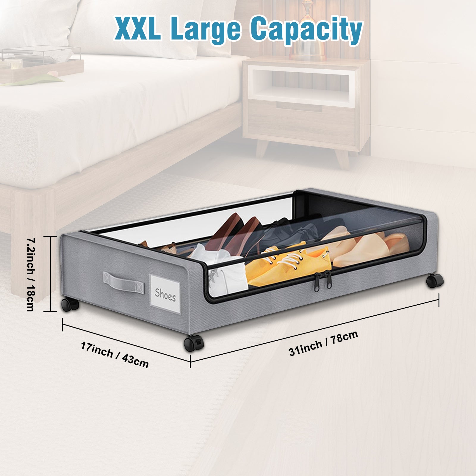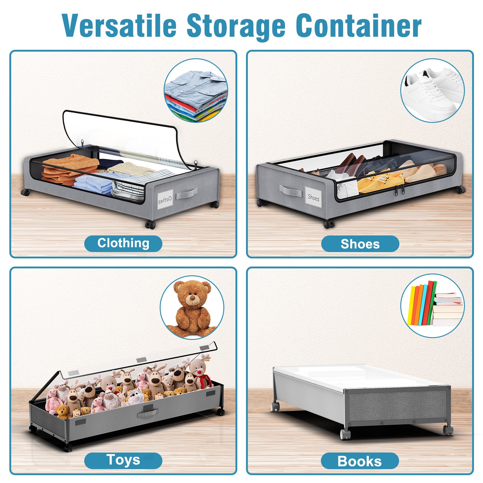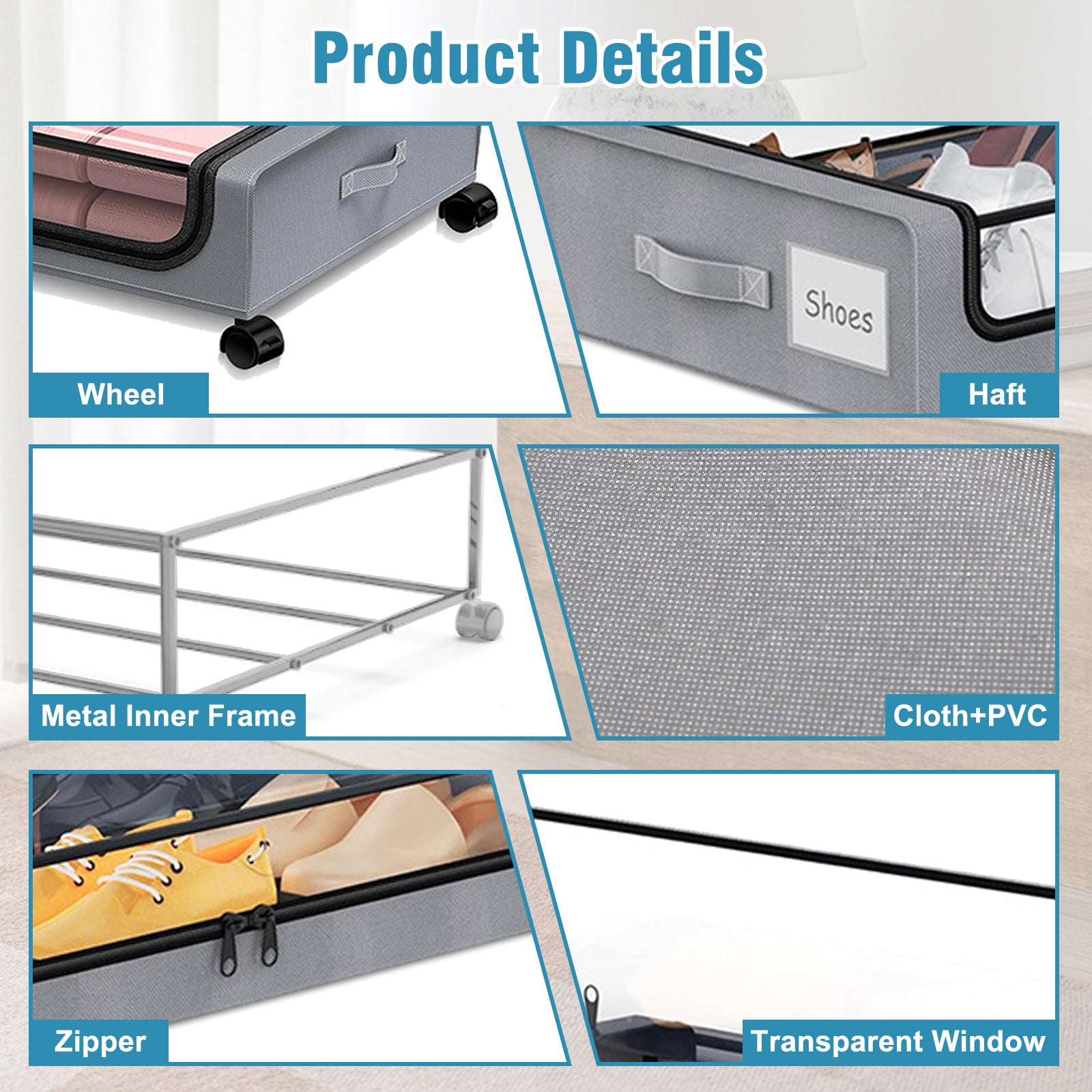Underbed Storage Containers with Wheels, Under Bed Storage Bins With Lids, Large Capacity Metal Clothes Organizer for Bedroom, Storage Box for Clothing Shoes Blankets, Gray