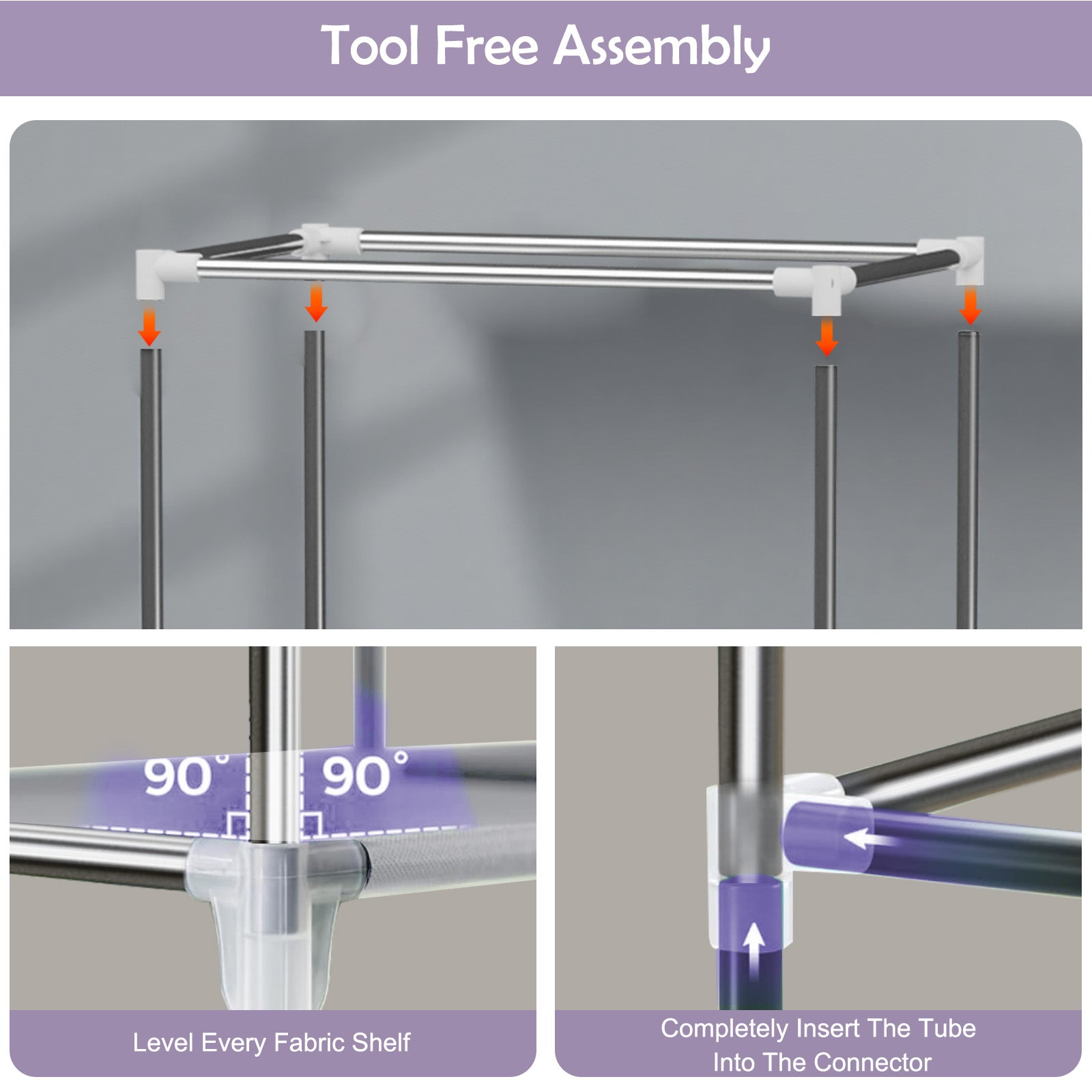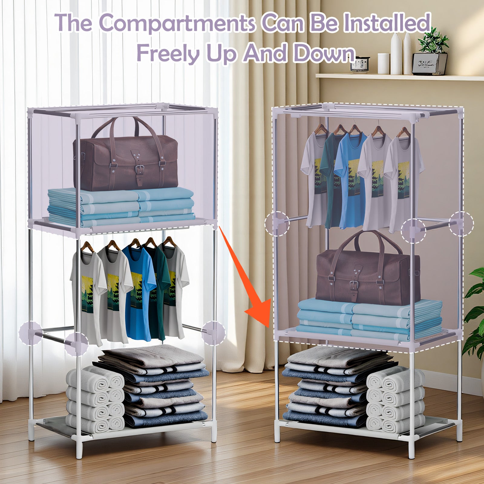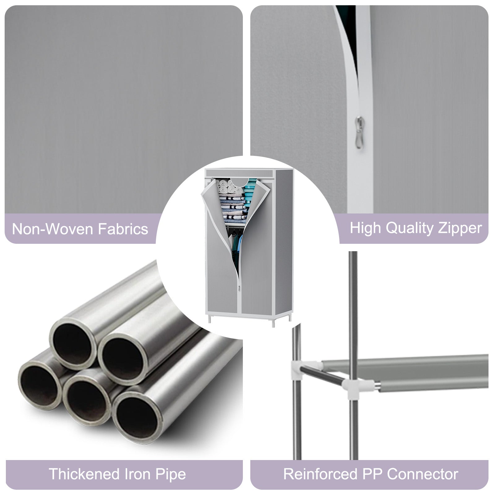 This fabric wardrobe combines practicality and convenience, making it an ideal storage solution for compact spaces. Constructed with high-density non-woven fabric cover, thickened stainless steel tubes, and PP plastic connectors, it features a wear-resistant and moisture-proof fabric, sturdy load-bearing tubes, and flexible joints for long-lasting durability.